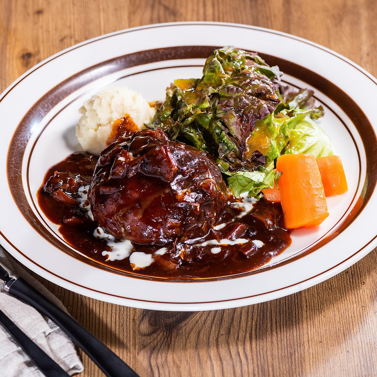 A luxurious gem of a dish made with a specially made hamburger steak topped with slowly simmered beef stew.